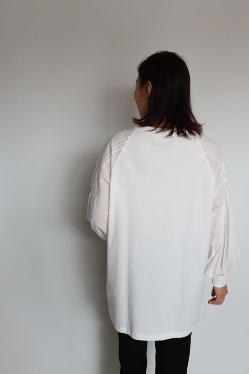 お袖を異素材でふんわり感だした甘さが魅力のロングTシャツ